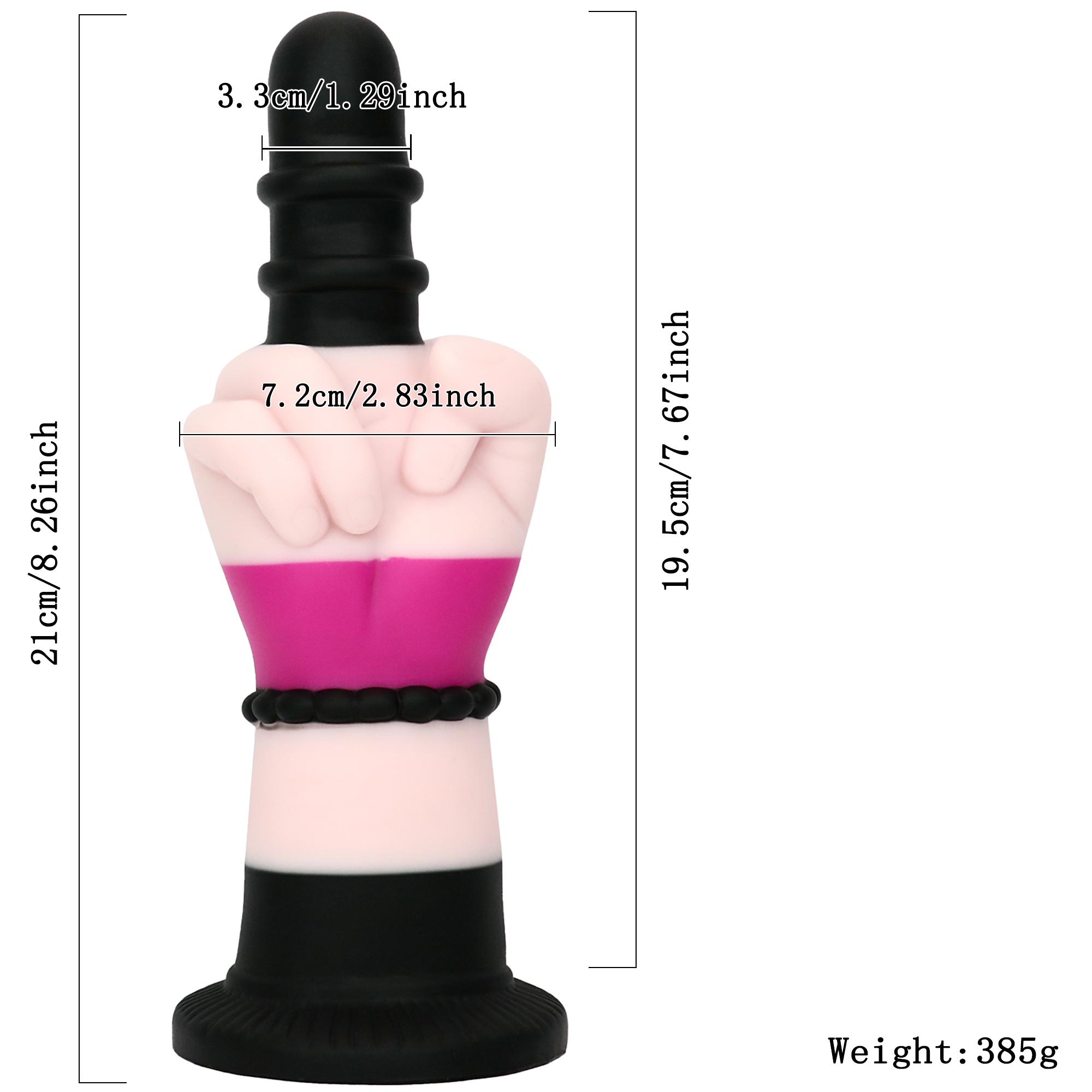 - 21 cm total length, 19.5 cm insertable; 7.2 cm diameter; 385 g net weight