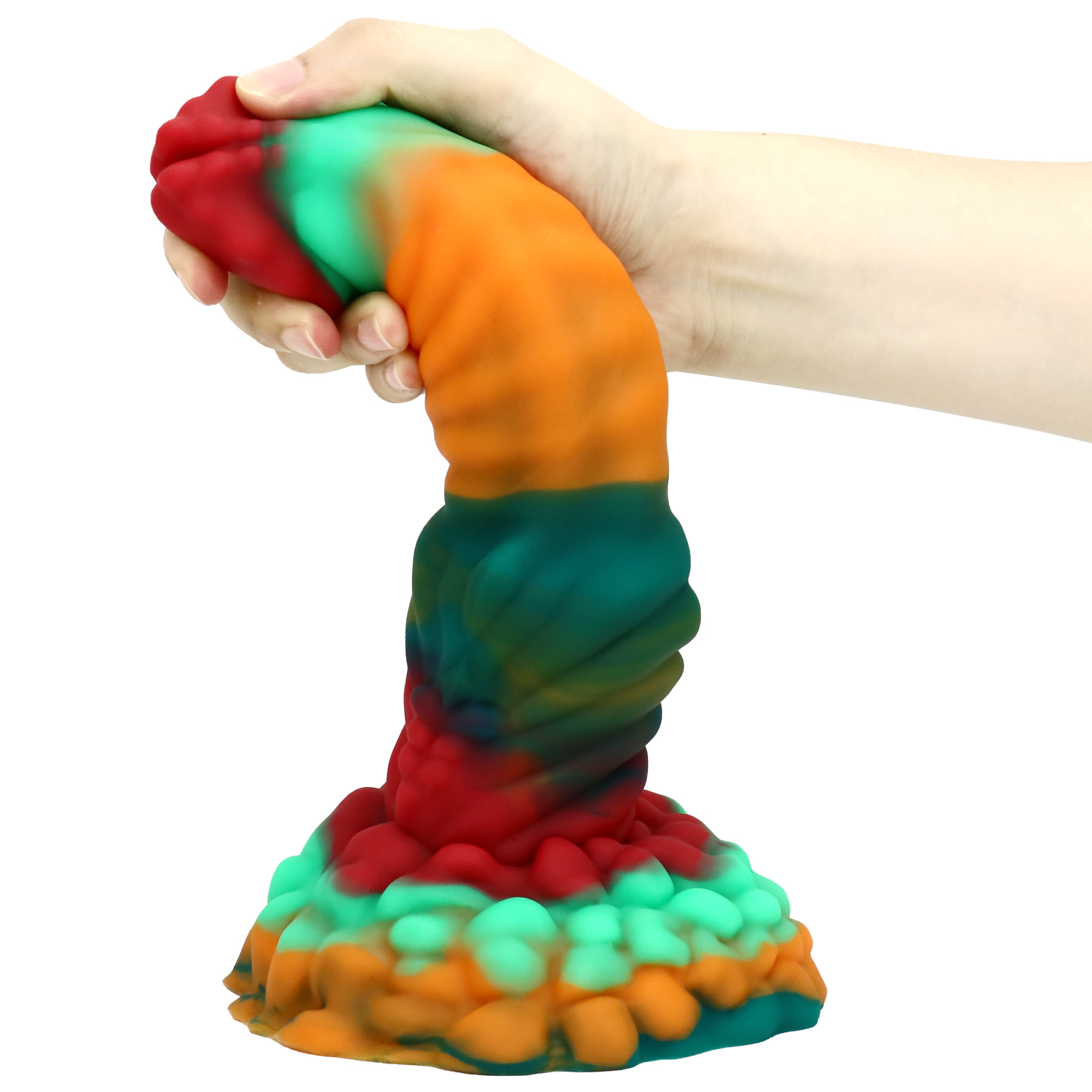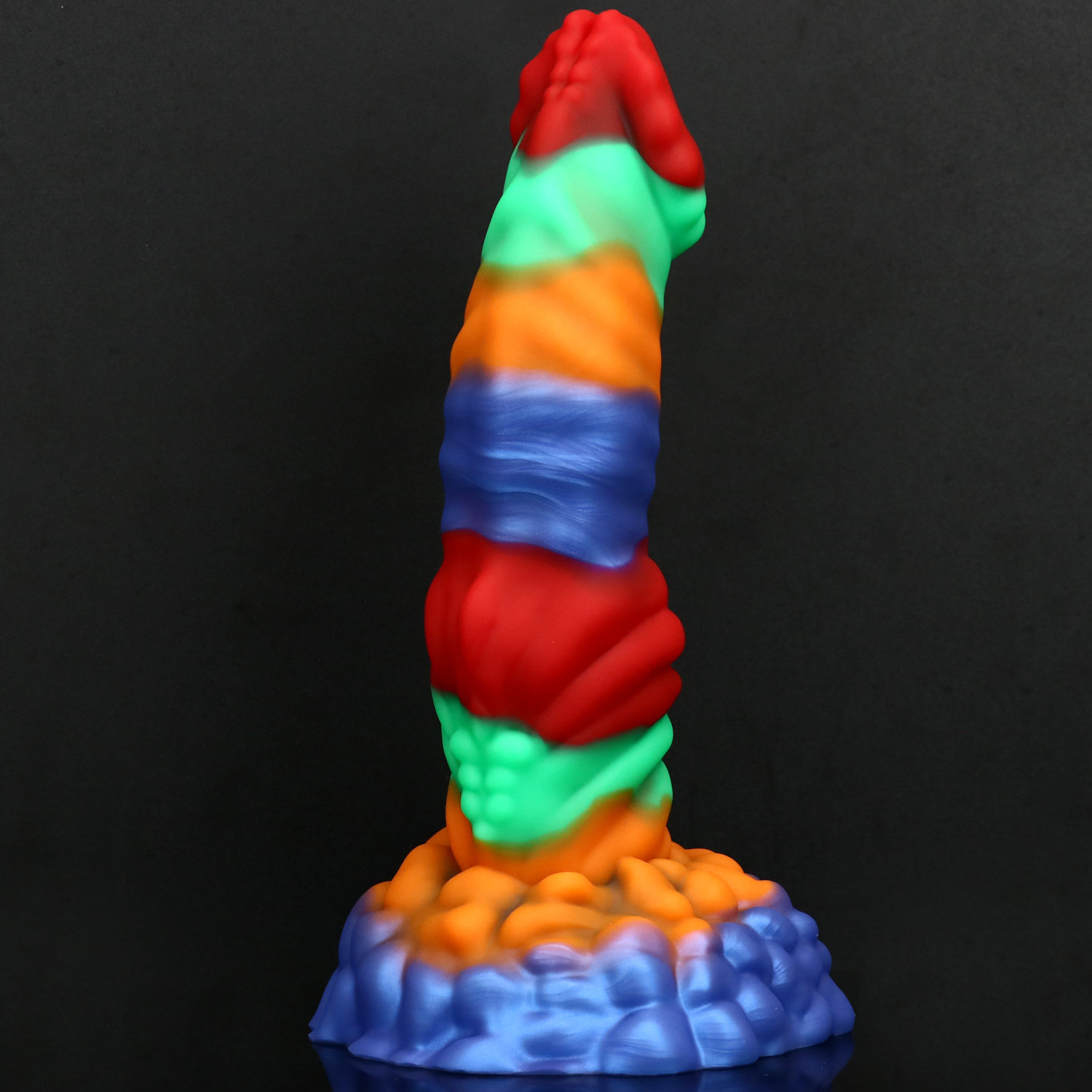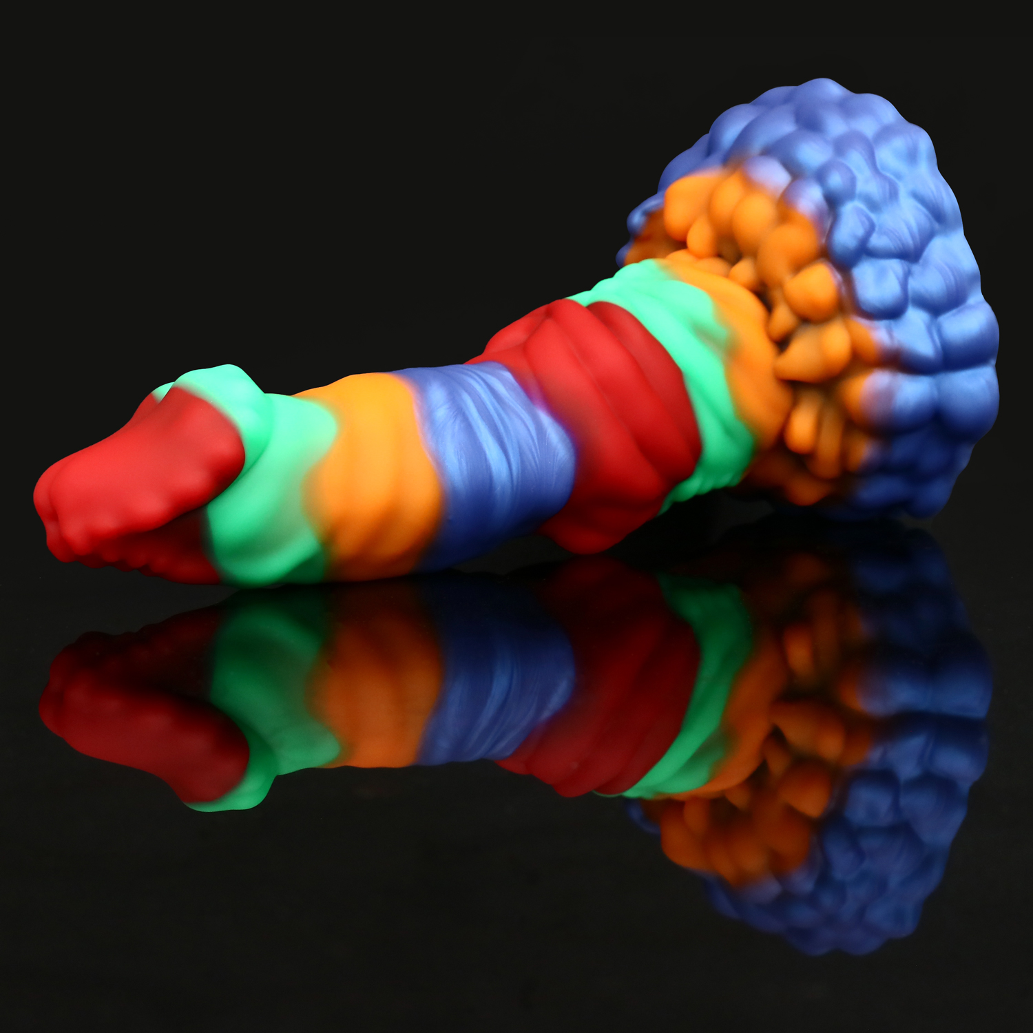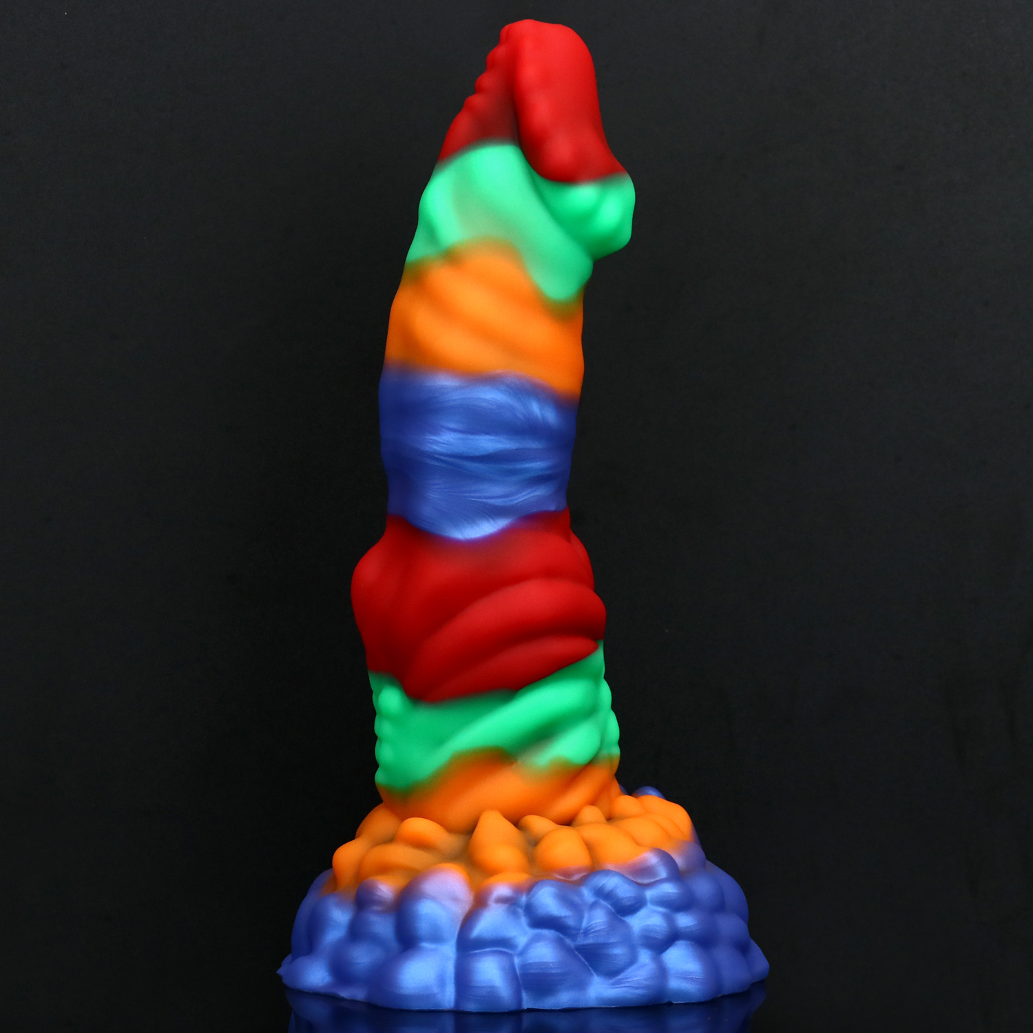 • Extra-large rainbow silicone dildo with an oversized suction base